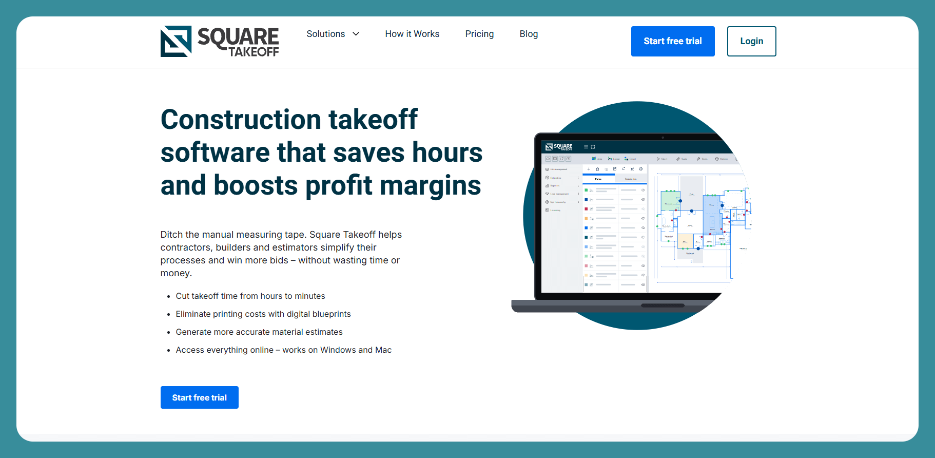 Square Takeoff is a cloud-based takeoff tool with simple blueprint upload, scaling, material/labor/equipment estimates, and reporting. It’s good for small contractors and tradespeople who want an affordable, easy-to-use online solution without advanced project modules.