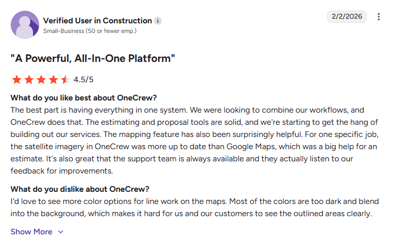 - Easy to use without forcing workflow changes: A G2 reviewer said OneCrew fit smoothly into their existing process and helped them stay organized across scheduling and job tracking without forcing them into rigid workflows. They also praised the platform’s customer support. (February 10, 2026)