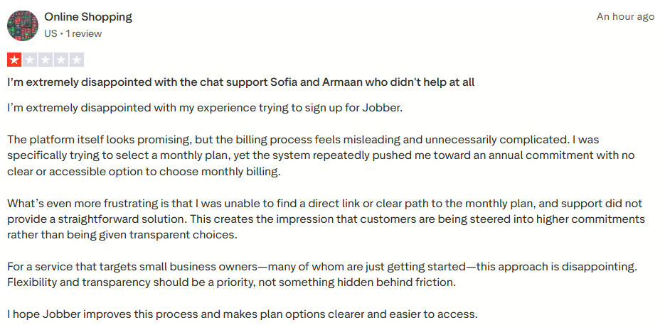 - Confusing plan pricing and frustrating downgrade options: Another reviewer on Trustpilot said Jobber’s pricing had become hard to understand, with too many plan variations and pressure to move into more expensive tiers.