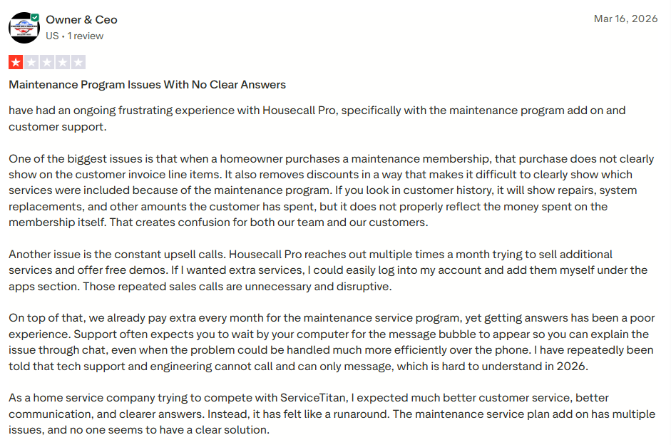 - Weak support when customers dispute charges: A Trustpilot reviewer said Housecall Pro did not do enough to support their business when customers disputed charges, even when the work had been authorized and completed.