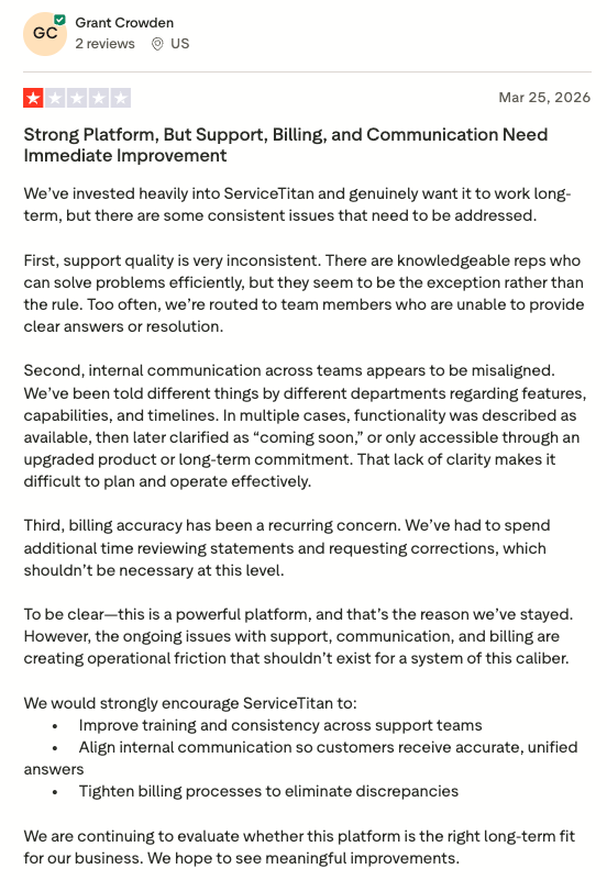 - Powerful platform with strong long-term potential but a steep learning curve: ServiceTitan offers robust capabilities and valuable support during onboarding, though its complexity can feel overwhelming early on and requires time to fully adopt. (Trustpilot, March 4, 2026)