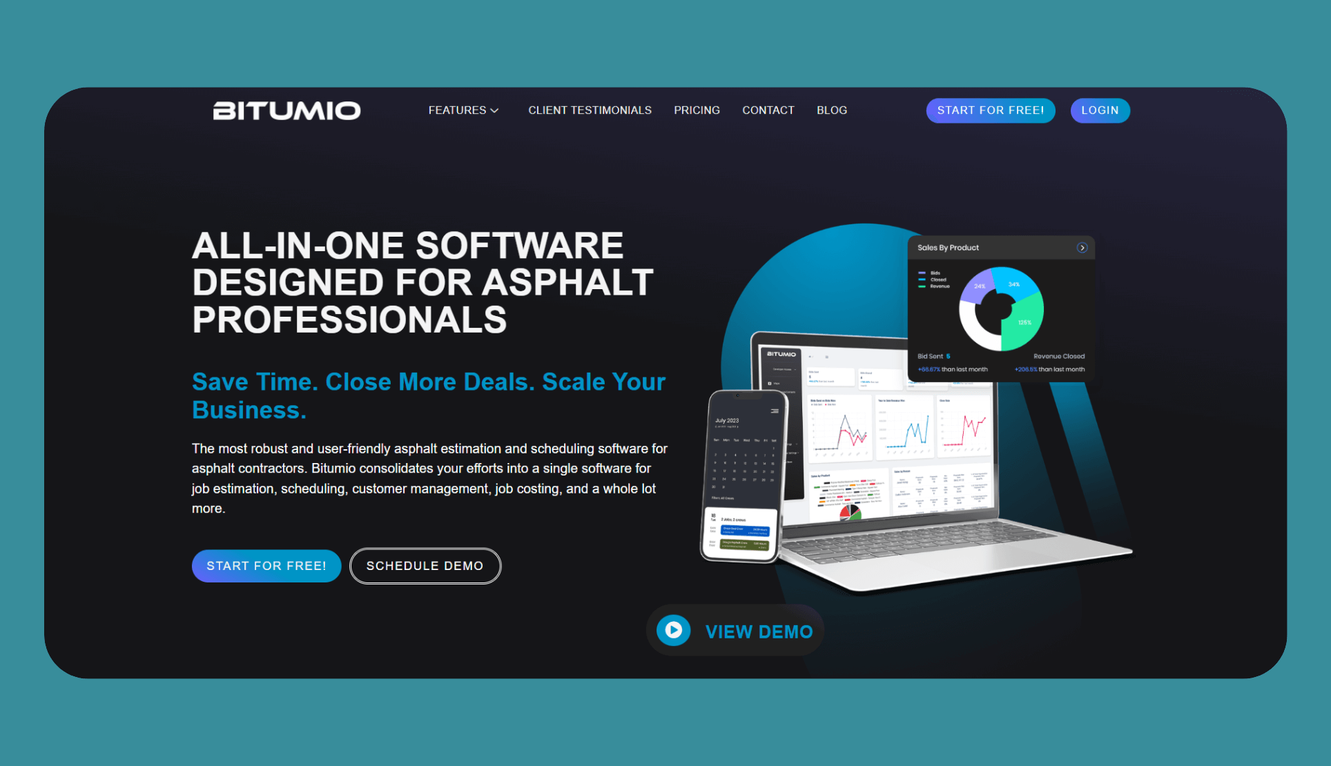 Bitumio is a specialized platform designed for asphalt maintenance contractors. It consolidates job estimation, customer management, scheduling, and job costing with a focus on sealcoating, crack filling, and repair work.